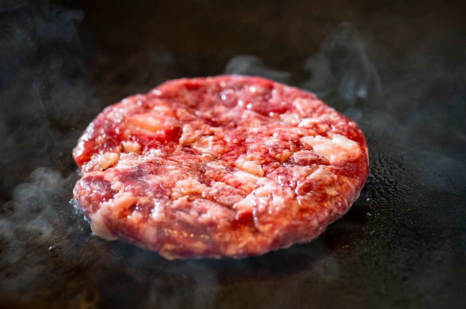 WorldBurgerの最大の特徴は、パティ(お肉)にあります。 一般的なハンバーガー店ではひき肉(ミンチ)を使いますが、私たちは塊肉を包丁で手切りし、つなぎを一切使わずに焼き上げる「ステーキパティ」を採用しています。
